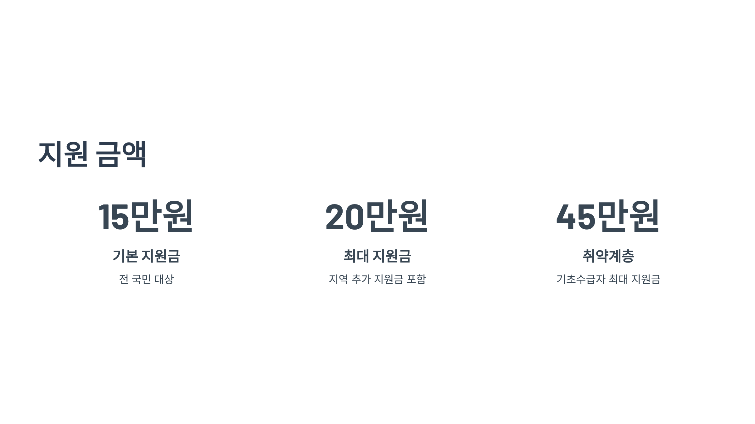 - 누가 얼마나 받을 수 있나요? 2025년 7월 21일부터 전 국민을 대상으로 1차 민생지원금 지급이 시작되었습니다. 기본적으로 1인당 15만 원이 지급되며, 거주 지역이 인구감소지역이라면 5만 원, 그 외 지역은 3만 원의 추가 지역 지원금이 더해져 최대 20만 원까지 받을 수 있습니다. 차상위 계층이나 한부모 가족, 기초수급자 등 취약계층은 더 많은 금액을 지원받을 수 있으니 해당 정보를 꼭 확인해 보세요. (예: 기초수급자는 40만 원 기본 + 지역 추가 지원금으로 최대 45만 원까지.)