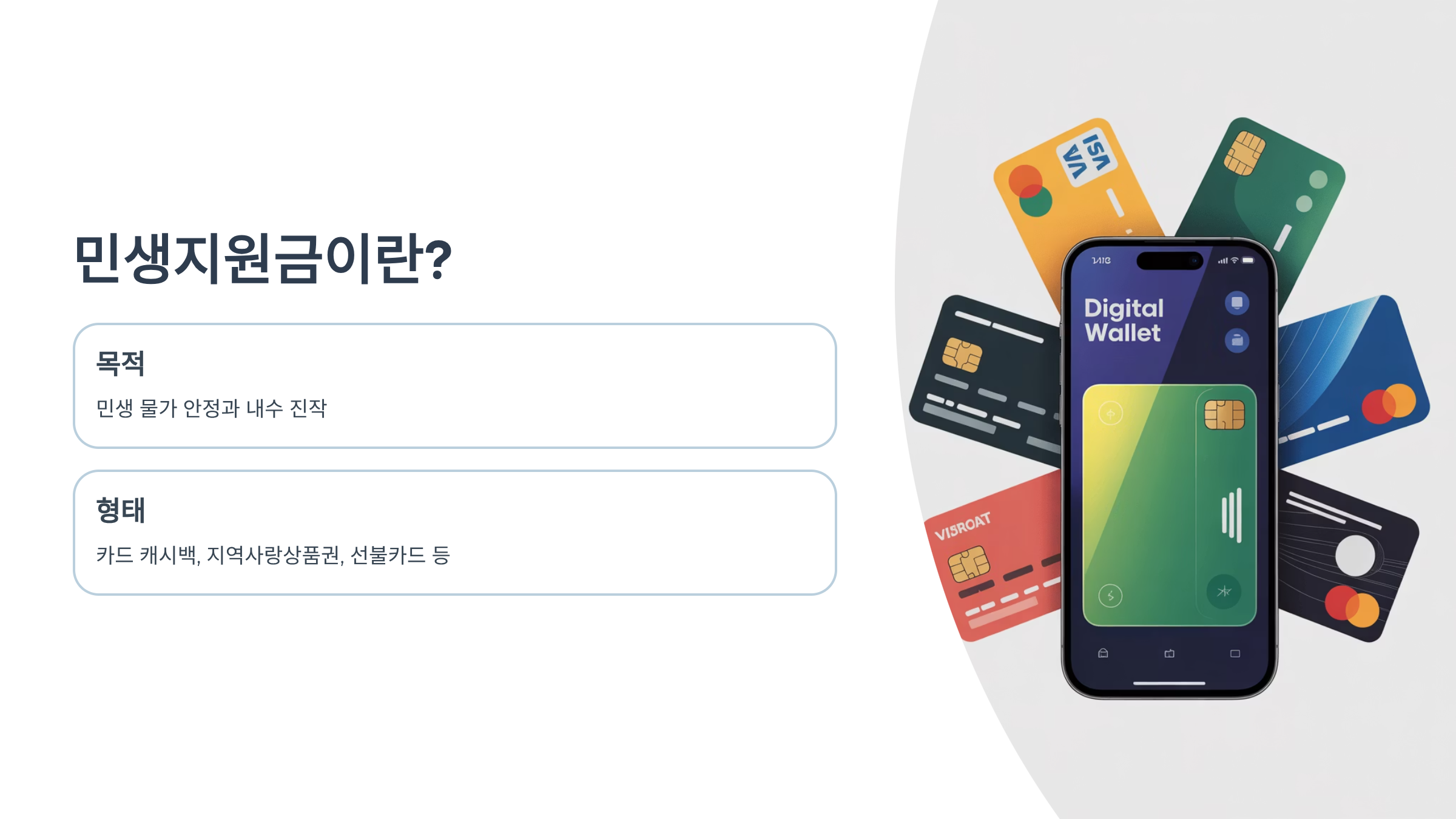 - 민생지원금이란? 민생 물가 안정과 내수 진작을 위해 정부와 각 지자체에서 지급하는 소비 촉진형 지원금입니다. 주로 신용/체크카드 캐시백, 모바일/카드형 지역사랑상품권, 선불카드, 지류형 상품권 등 다양한 형태로 지급됩니다. 편의점, 마트, 전통시장, 동네 마트, 약국 등 우리 생활과 밀접한 다양한 가맹점에서 자유롭게 사용할 수 있습니다. 단, 백화점, 대형마트, 온라인 쇼핑몰, 프랜차이즈 직영점 등에서는 사용이 제한될 수 있으니 사용 전 확인하는 것이 좋습니다.