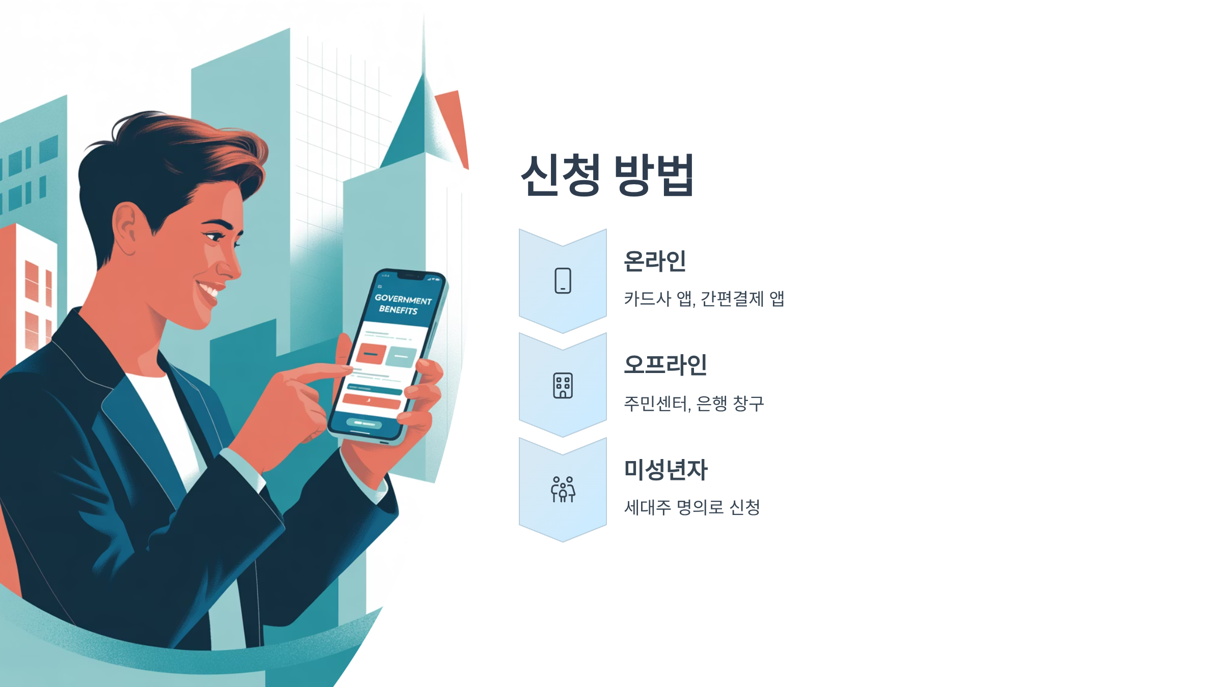 - 오프라인 신청: 주민센터나 은행 창구를 방문하여 신청할 수 있으며, 고령자, 장애인 등 거동이 불편한 분들을 위한 '찾아가는 신청 서비스'도 운영됩니다. (대리 신청 가능)