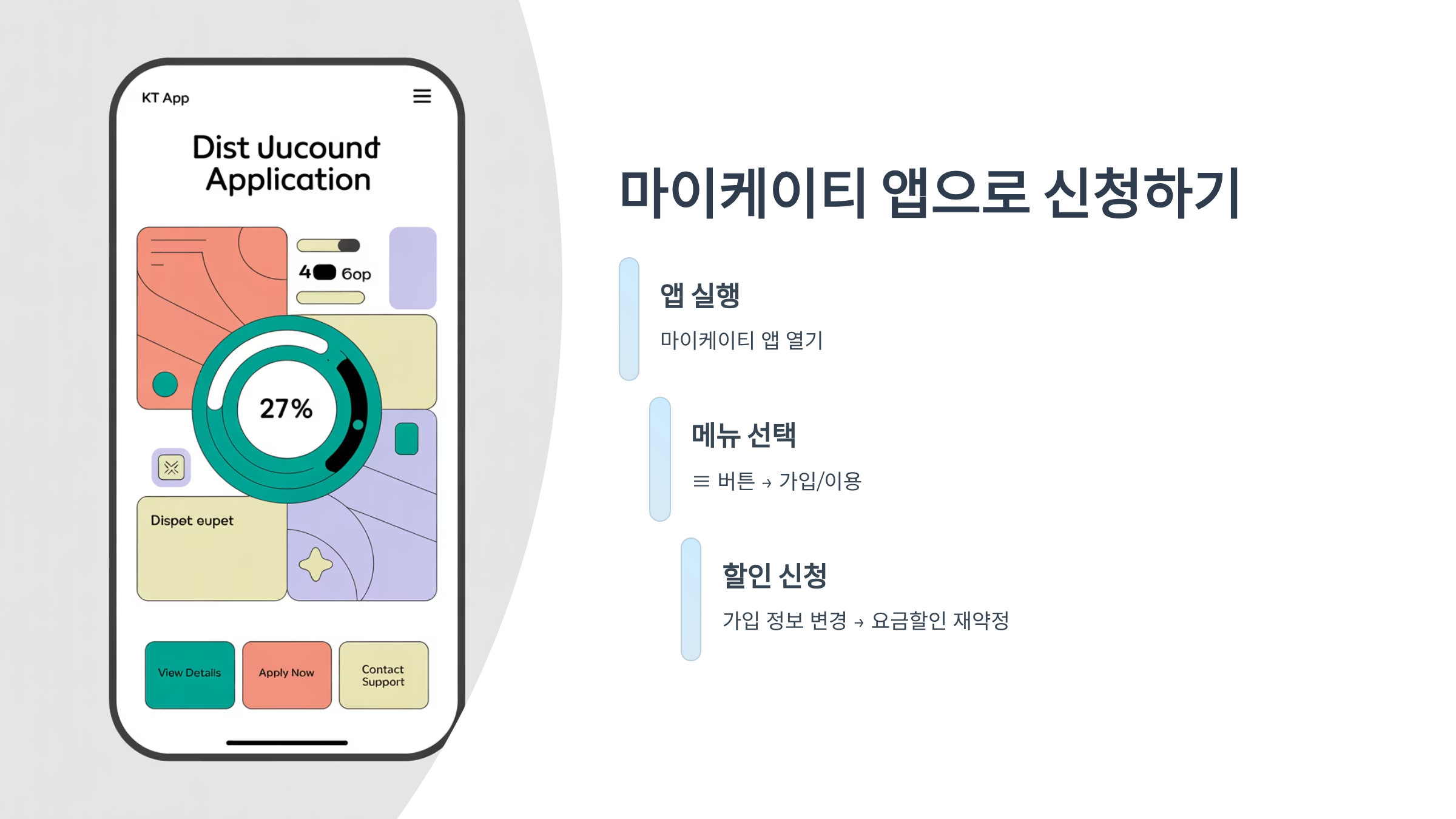 KT 사용자의 경우, '마이케이티' 모바일 앱을 통해 아주 간편하게 선택 약정 할인을 신청하거나 기존 약정을 재약정할 수 있습니다. 굳이 고객센터에 전화해서 상담사와 연결될 때까지 기다리거나 대리점을 방문할 필요 없이, 스마트폰으로 몇 번의 터치만으로 쉽게 신청할 수 있으니 꼭 시도해 보시길 권해드립니다. 시간도 절약하고 불필요한 번거로움을 피할 수 있는 가장 스마트한 방법이에요.