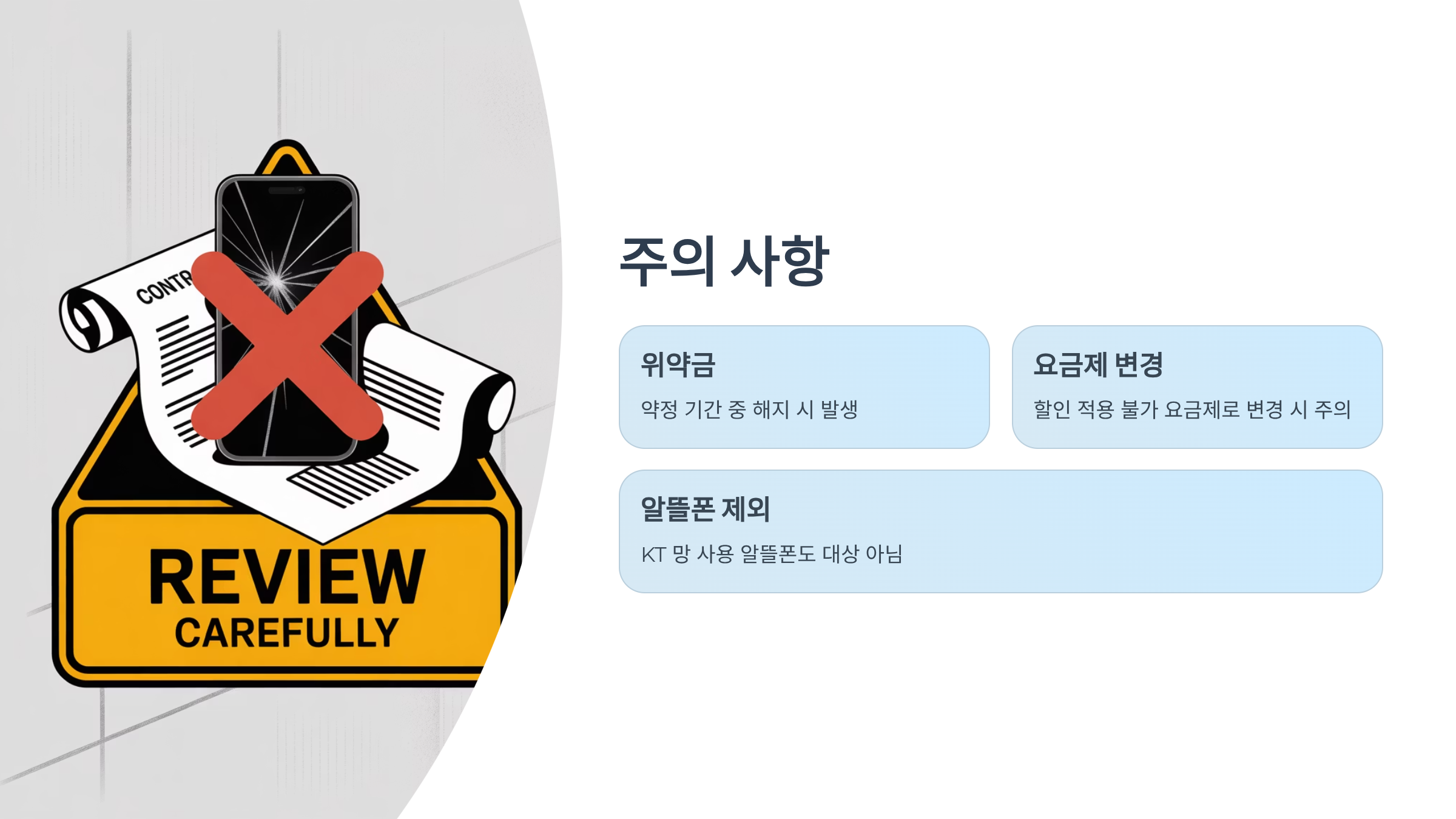 선택 약정 할인은 분명 매력적인 통신비 절약 방법이지만, 몇 가지 주의해야 할 사항들도 있습니다. 미리 이 점들을 파악하고 있다면 나중에 예상치 못한 불이익을 당하는 일을 효과적으로 막을 수 있을 거예요.