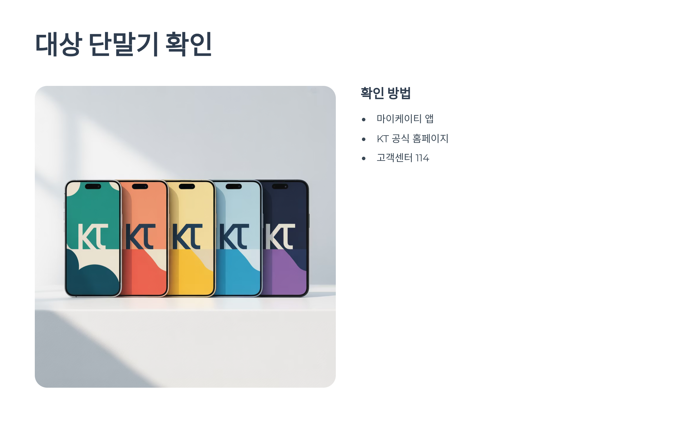 - 사용하는 단말기가 선택 약정 가능 단말기 목록에 포함되어야 합니다: 내가 현재 사용하고 있는 휴대폰 단말기가 선택 약정 할인 대상에 포함되는지 여부를 미리 확인하는 것이 좋습니다. 이 정보는 KT 공식 홈페이지에서 '선택 약정 대상 단말기 조회' 메뉴를 검색하거나, 마이케이티 앱 내에서 확인하거나, KT 고객센터(국번 없이 114)에 전화해서 문의하면 쉽게 알아볼 수 있습니다.