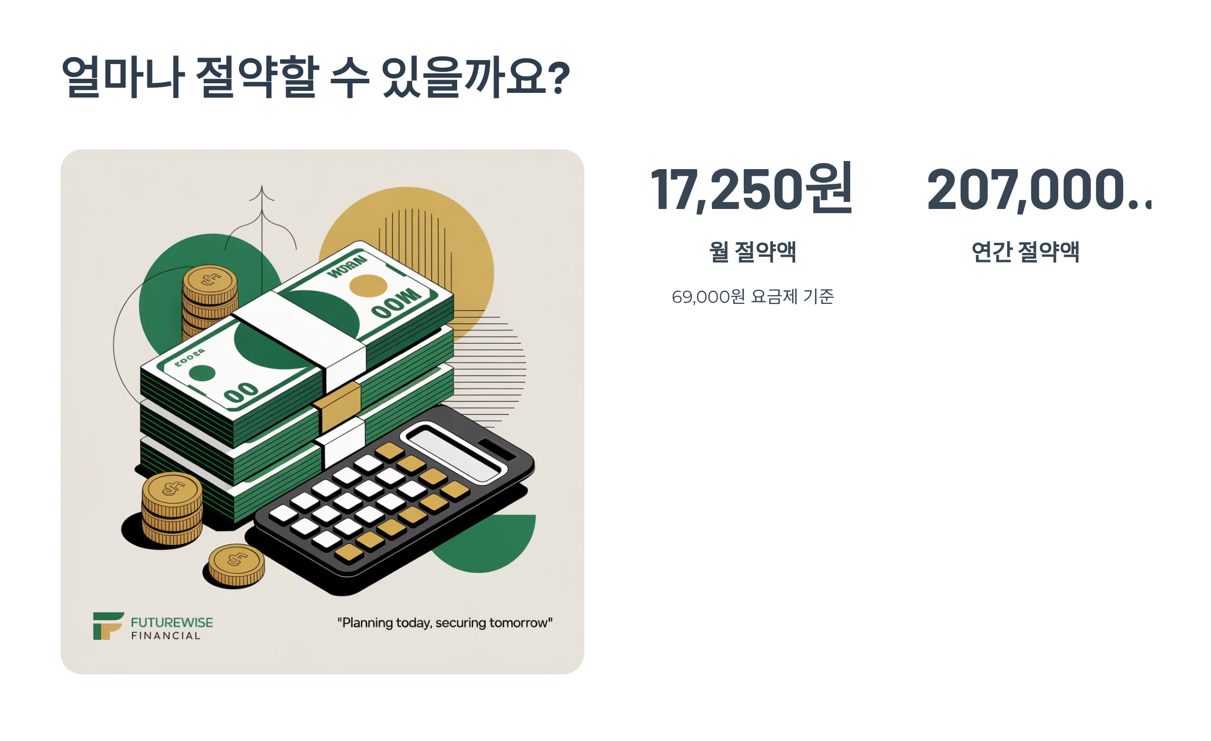 예를 들어, 여러분이 현재 월 69,000원짜리 요금제를 사용하고 있다면, 선택 약정 할인을 통해 매달 약 17,250원을 절약할 수 있습니다. 이는 연간 최대 207,000원을 아낄 수 있는 엄청난 금액이며, 2년 약정을 하면 거의 40만 원 이상을 절약할 수 있게 되는 셈이죠. 이 정도면 작은 가전제품을 하나 살 수도 있고, 몇 달치 스트리밍 서비스 구독료를 충분히 충당할 수 있는 액수입니다.