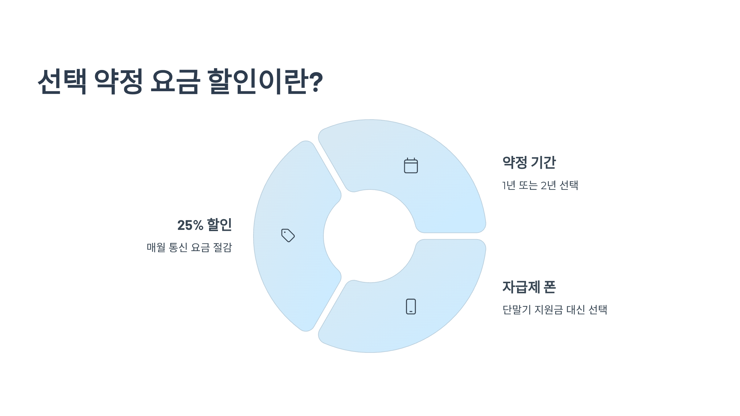 선택 약정 요금 할인은 이동통신사가 단말기 구입 시 제공하는 지원금을 받지 않는 고객을 대상으로, 그 대신 매월 통신 요금의 25%를 할인해 주는 제도입니다. 고객은 1년 또는 2년 약정 기간을 선택할 수 있으며, 이 기간 동안 꾸준히 통신비를 절약할 수 있다는 큰 장점을 가지고 있습니다.
